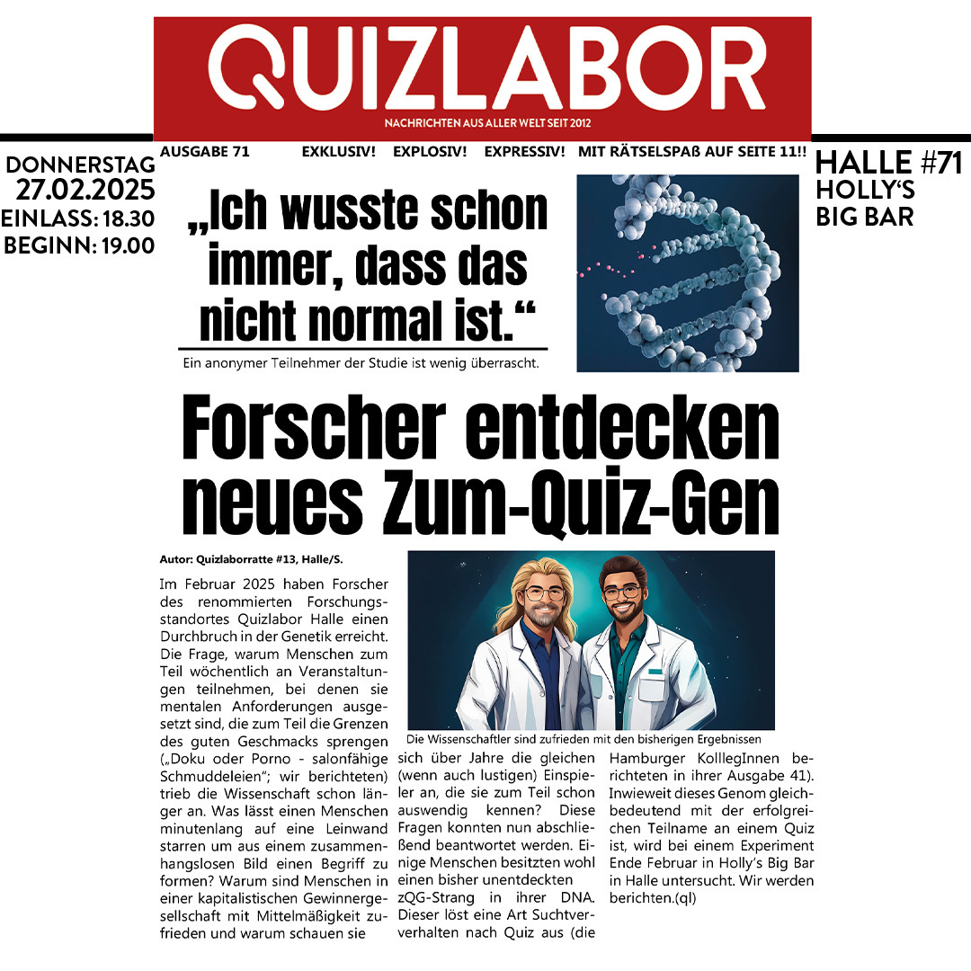 zQG-Strang in ihrer DNA. Dieser löst eine Art Suchtververhalten nach Quiz aus (die Hamburger KolllegInnen berichteten in ihrer Ausgabe 41). Inwieweit dieses Genom gleichbedeutend mit der erfolgreichen Teilname an einem Quiz ist, wird bei einem Experiment Ende Februar in Holly‘s Big Bar in Halle untersucht. Wir werden berichten.(ql)